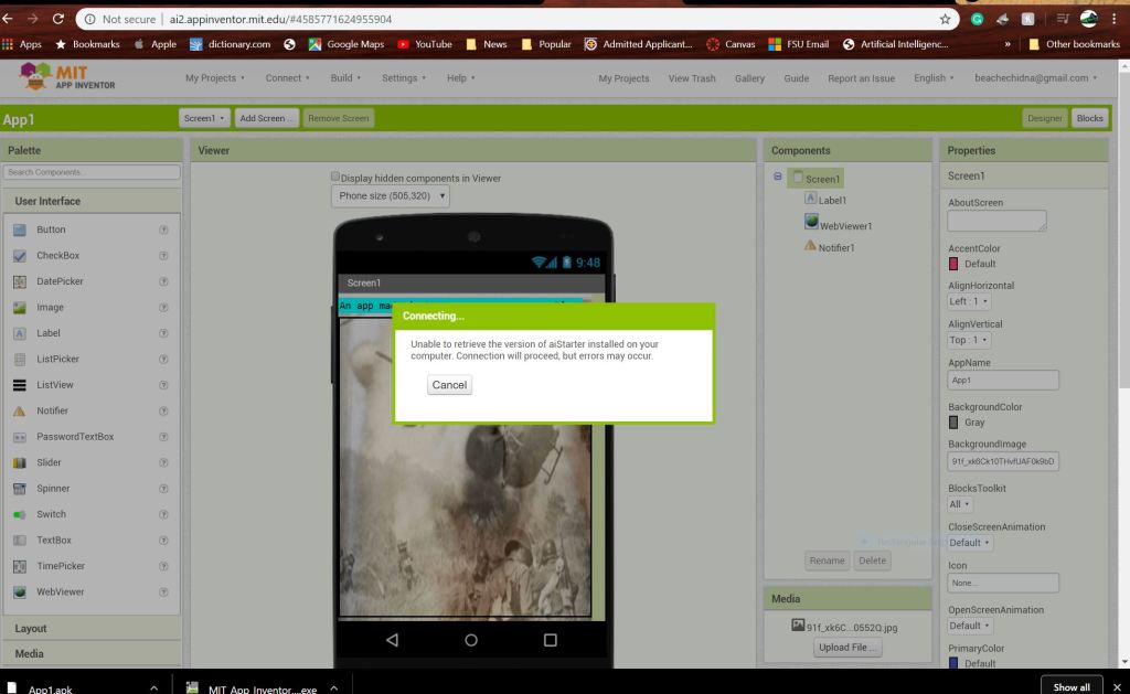 One function of the application that I was able to successfully implement were a pop-up notification that appeared when the back button on the device is pressed (see screenshot 2). Another function that I was able to embed within the application was a web viewer that is linked to my blog page (screenshot 1). Additionally, I was able to place a meme as a background picture on the application (screenshot 1).